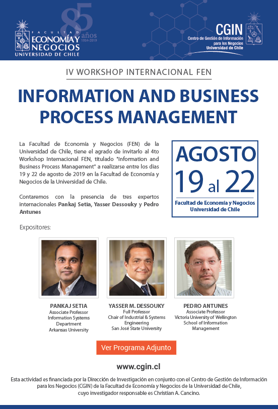 Tercer Coloquio: Pedro Antunes (Victoria University of Wellington). Jueves 22 de Agosto, 11:15 y 12:45 horas, en Placa-302. Título de la Presentación: "Business Processes and Flexibility: A Theoretical Perspective". El abstract del paper lo pueden ver en el programa adjunto, pg.6.